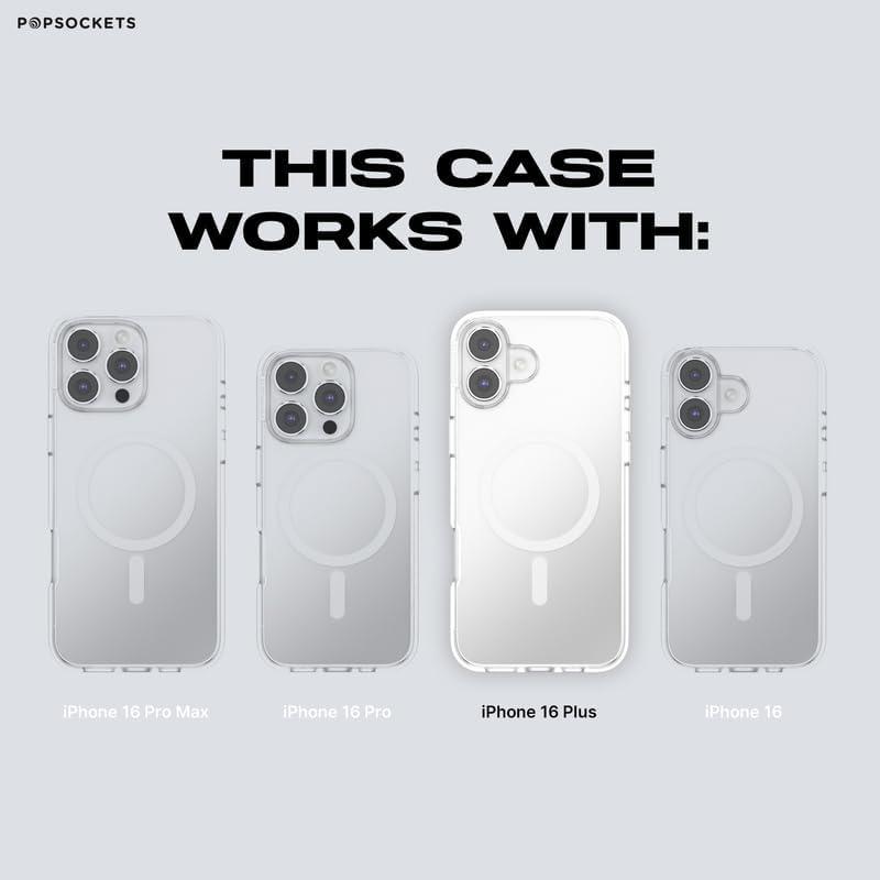 The PopSockets for iPhone 16 Plus case features MagSafe capabilities to attach MagSafe accessories and utilize wireless charging. The round phone grip for MagSafe (sold separately) simply snaps on and off your phone case – no adhesive. The phone case for iPhone 16 Plus has certified 10 ft drop protection for a durable design. Add a PopSockets round grip for MagSafe to help avoid phone drops and give you kickstand capability. The iPhone 16 Plus phone case pairs perfectly with our Suction Mount and Vent Mount for MagSafe. iPhone and MagSafe are trademarks of Apple Inc., registered in the U.S. and other countries and regions.