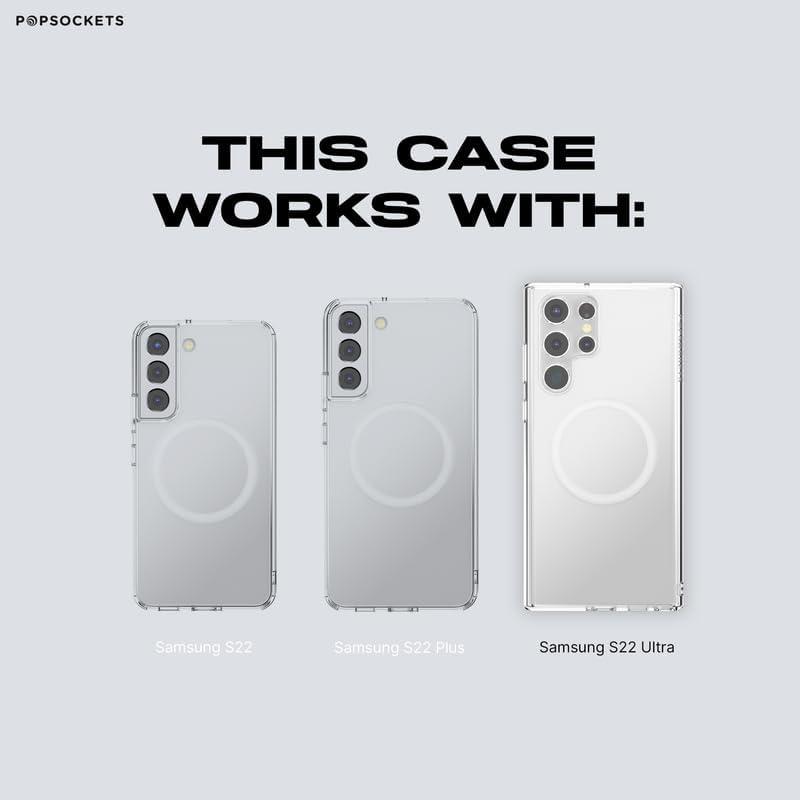 This PopSockets PopCase is a cell phone case compatible with the Samsung Galaxy S22 Ultra. It features PopSockets’ new MagSafe-complatible integrated magnetic attachment system to provide a secure grip – letting you add your favorite PopGrip (sold separately) to text with one hand or prop up your phone for easy viewing or content creation, and then quickly remove it for trouble-free wireless charging with your choice of wireless charging adapters or power packs. PopSockets’ round PopGrip phone grips (sold separately) compatible with MagSafe simply snaps on and off this PopSockets MagSafe-compatible phone case for your Galaxy S22 Ultra – no adhesive required. This phone case is also compatible with Qi & Qi2 wireless chargers and battery packs (but please note that some battery packs and accessories may overlap the camera area). Galaxy and Samsung are trademarks of Samsung Electronics Co. Ltd., registered in the U.S. and other countries and regions. MagSafe is a trademark of Apple Inc., registered in the U.S. and other countries and regions. PopSockets’ PopGrip and PopCase trademarks are registered in the U.S. and other countries and regions. PopSockets’ related patents are found here: ps-ip.co