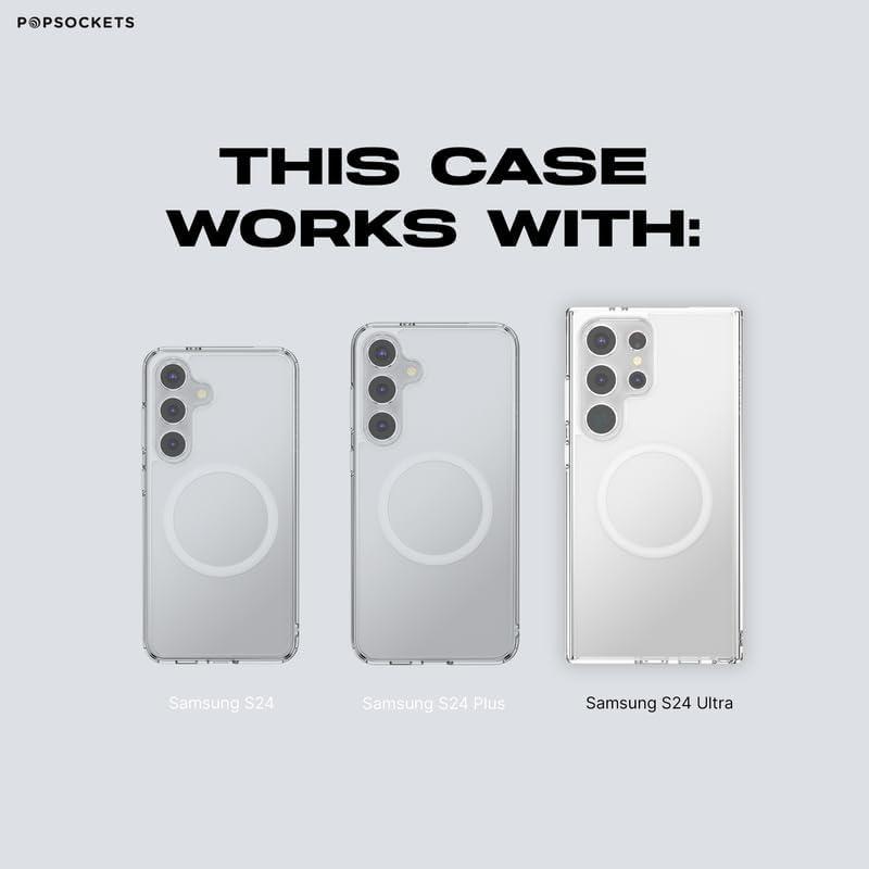 This PopSockets PopCase is a cell phone case compatible with the Samsung Galaxy S24 Ultra. It features PopSockets’ new MagSafe-complatible integrated magnetic attachment system to provide a secure grip – letting you add your favorite PopGrip to text with one hand or prop up your phone for easy viewing or content creation, and then quickly remove it for trouble-free wireless charging with your choice of wireless charging adapters or power packs. PopSockets’ round PopGrip phone grips compatible with MagSafe simply snaps on and off this PopSockets MagSafe-compatible phone case for your Galaxy S24 Ultra – no adhesive required. This phone case is also compatible with Qi & Qi2 wireless chargers and battery packs (but please note that some battery packs and accessories may overlap the camera area). Galaxy and Samsung are trademarks of Samsung Electronics Co. Ltd., registered in the U.S. and other countries and regions. MagSafe is a trademark of Apple Inc., registered in the U.S. and other countries and regions. PopSockets’ PopGrip and PopCase trademarks are registered in the U.S. and other countries and regions. PopSockets’ related patents are found here: ps-ip.co